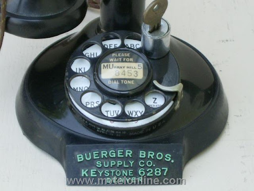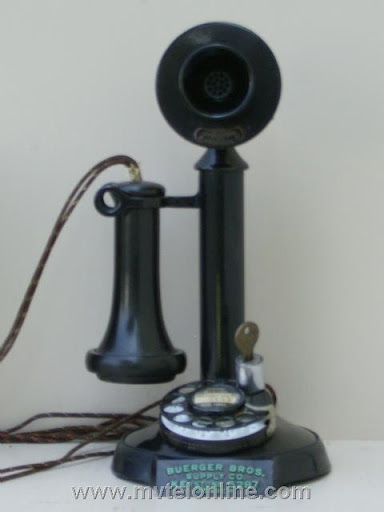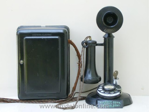 Western Electric 50C candlestick telephone. This antique telephone is equipped with a 2AB metropolitan dial with numbers and letters porcelain dial plate. It is still connected to it's original subset. This telephone was originally installed in Brooklyn NY. Note the rubber advertising attachment on the base.. For sale, $500.
