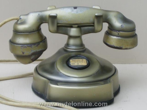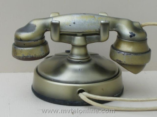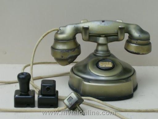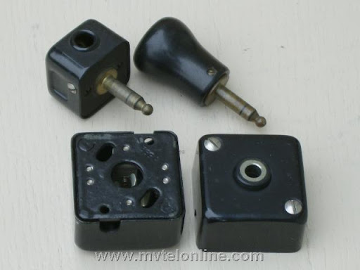 Western Electric 205 manual cradle telephone. This antique telephone was modified to a single line phone. It is factory painted bronze. This phone was used at the Bell System exhibit at the 1939 New York Worlds Fair. Note the early paint matched single prong plug, also pictured are 2 other early single prong plugs and jacks.