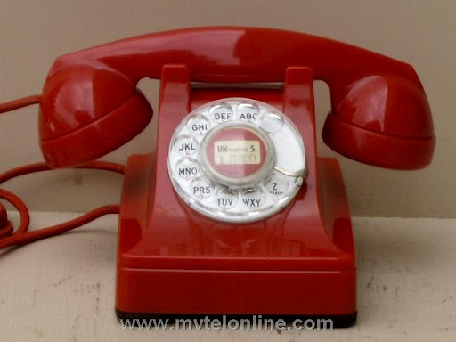 Western Electric 302 desk phone. This 1940s or 1950s era telephone is a rare special order colored red thermoplastic housed example. The cloth cords are colored to match the phone. A color coordinated mask is placed over the phone number card.