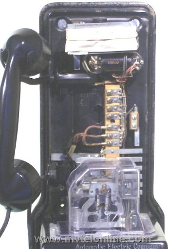 Automatic Electric 62. Early AE prepay payphone with AE 40 type handset. This antique telephone has a nice daisy dial face, numbers only with metal shroud. It is mounted to a 139A bracket. Beautiful 5 cent antique payphone in original condition. This is one of the first models Automatic Electric made after purchasing Gray.