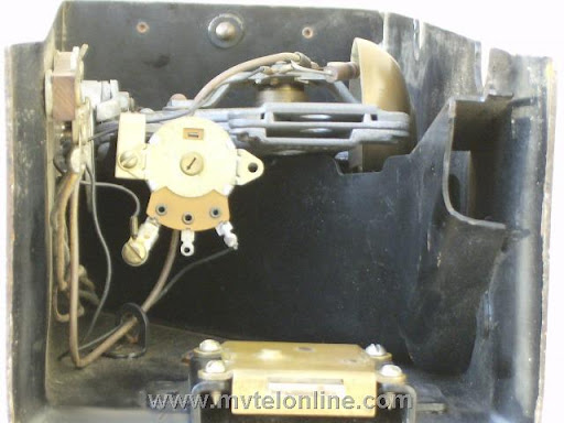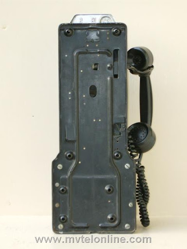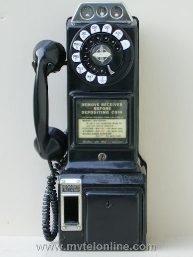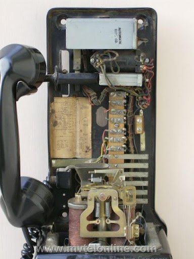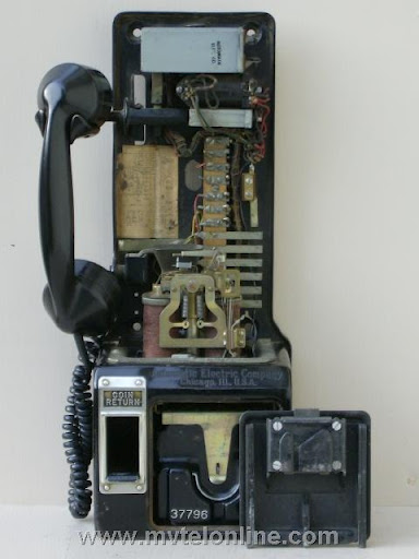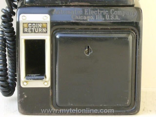 Automatic Electric 64C. This antique telephone is equipped with an AE 40 type handset and a Bakelite dial shroud with porcelain "daisy" face. Note the "salad fork" handset hook. This is a nice original 5 cent prepay payphone.