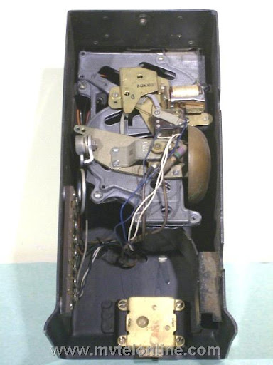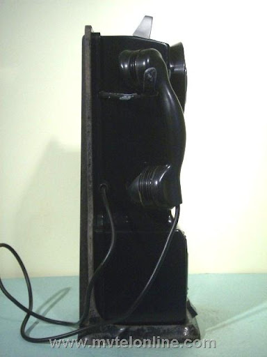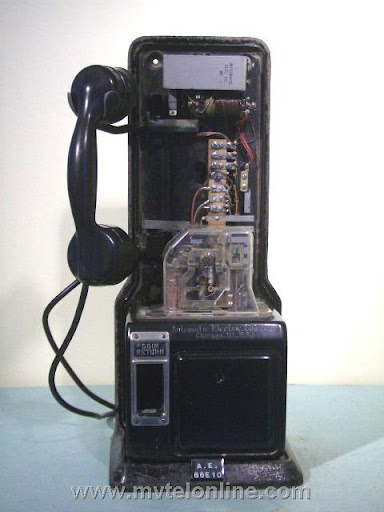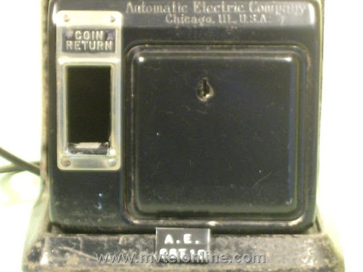 Automatic Electric 66 E 10. This antique telephone is equipped with a Bakelite AE 34 type handset and a Bakelite dial shroud with a nice "daisy" face. This is a post-pay 10 cent (dime only) payphone. It is mounted to a 139A bracket. Note the nice coin relay cover. This is another of the early Automatic Electric models.