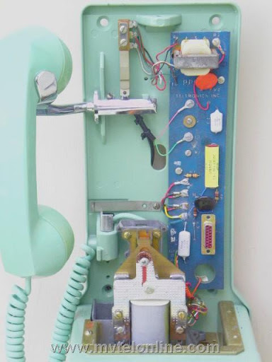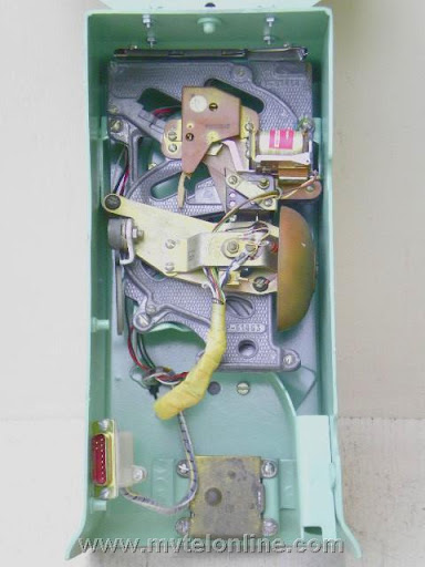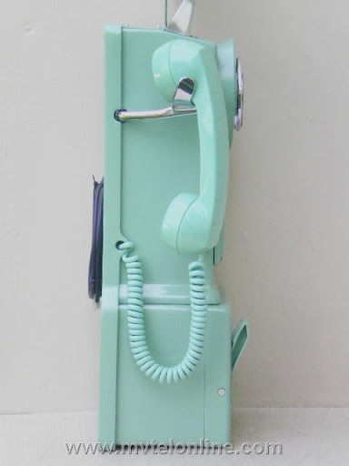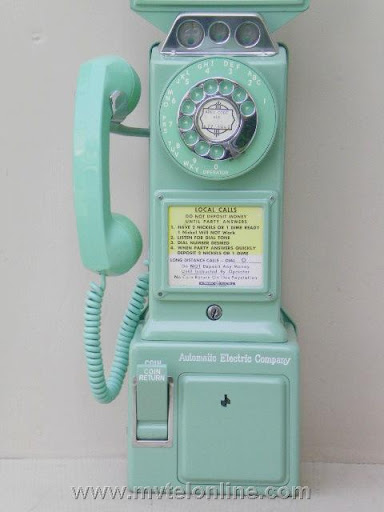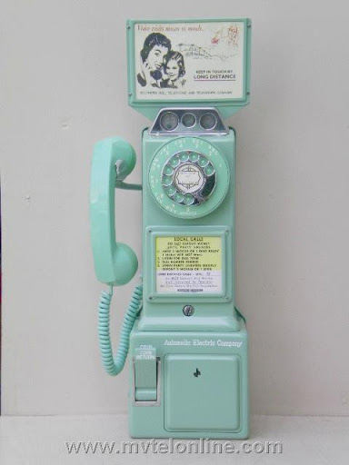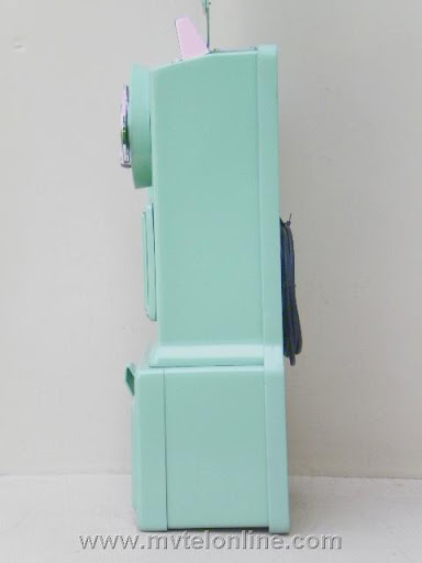 Automatic Electric LPB-82-55. An automatic, prepay 10 cent payphone. The body is painted turquoise the plastic parts are turquoise as well, the dial finger wheel is chrome. Automatic Electric made payphones at this time in 12 colors.