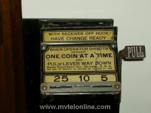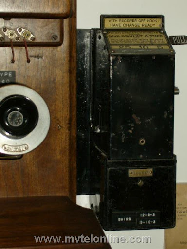 Barid Equipment Co. Chicago 3 slot single lever coin collector. When a coin is dropped in the proper slot a sound is made that is specific to that denomination. The operator would hear the sounds and be aware of what was inserted. It is mounted to an Antique Western Electric 2 box telephone.