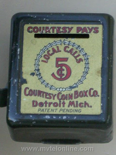 Courtesy Pays, Courtesy Con Box Company. Used on an honor system. It is mounted to an antique Western Electric 50AL candlestick telephone.