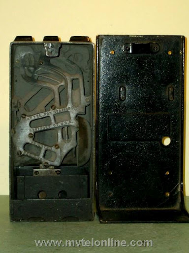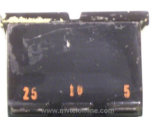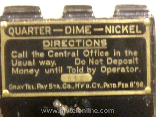 Gray #11 coin collector. An early model with metal instruction sign and very short tabs above the coin slots. This would mount with a bracket to the back of a wall telephone. Note at the top of the sign it says "quarter, dime, nickel", 25, 10, & 5 are also stenciled on the top of the case behind the slots. Later models had taller tabs with 25, 10 & 5 on them. View my article Gray 11