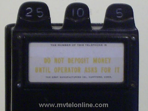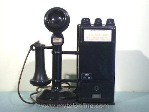Gray #20 shelf or counter mount 5, 10, 25 cent coin collector. It is attached to a Western Electric 20AL antique candlestick telephone. When a coin is dropped and hits the bell or gong the sound resonates through the case, then through the connecting arm into the phone and would be picked up by the transmitter. From the transmitter the sound is transmitted to the operator. The candlestick telephone has an unusual phone number attachment on it. View my article Gray 20 Coin Collector
