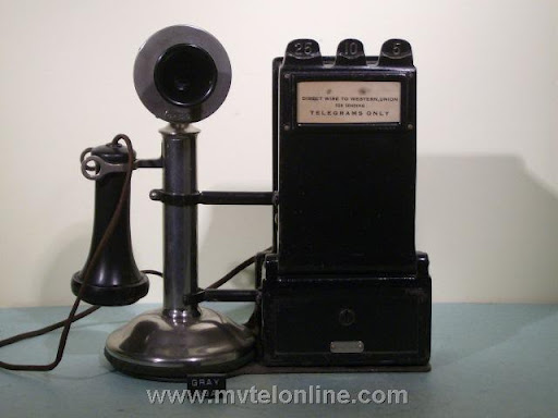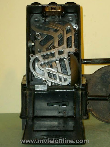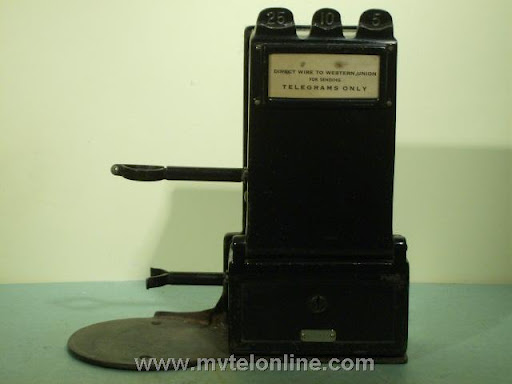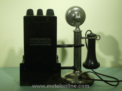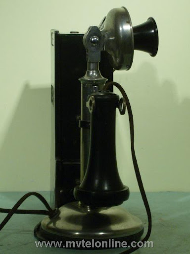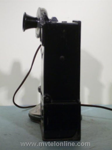 Gray #23A shelf or counter mount 5, 10, 25 cent coin collector. It is attached to a Western Electric 20B antique candlestick telephone. When the operator asked for a deposit a coin dropped would strike & ring a bell once for a nickel, twice for a dime, a quarter would hit a gong and make a bong sound. The sound would resonate through the case, then through the connecting arm into the phone and would be picked up by the transmitter. From the transmitter the sound is transmitted to the operator. View my article Gray 23A
