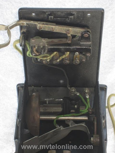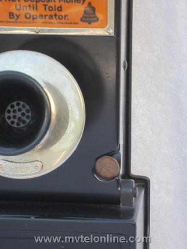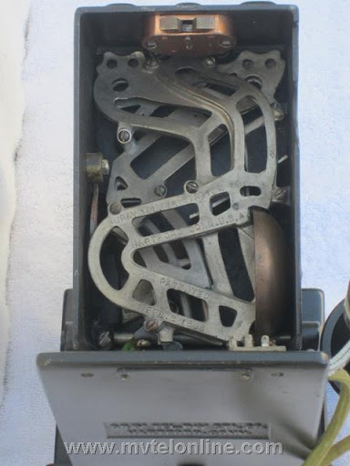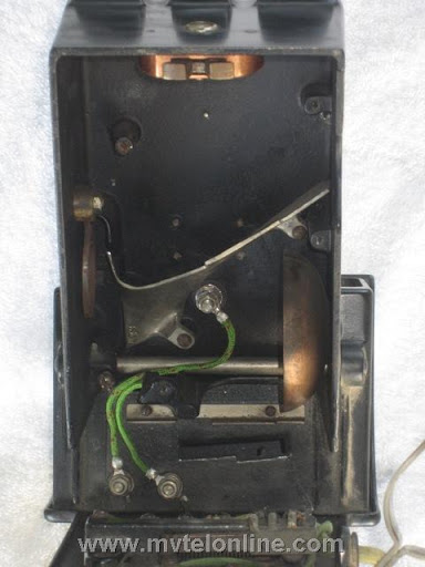 The earliest version of the 23D. The distinction of early is: thin backboard, Gray transmitter mount, all cast iron (including bottom) with two terminals. The bonus is the coin reject with intact coin reject basket. Not many survived and the internal basket is indeed very rare. Most of the coin reject type 23 D's have the side slot. Equipped with a WE OST receiver and original WE celluloid instruction card. Pictures with the coin chute removed expose the return chute & transmitter wiring. View my article Gray 23D Coin Collector