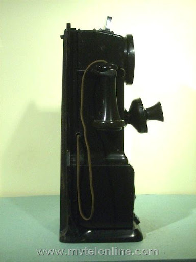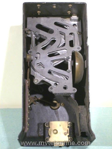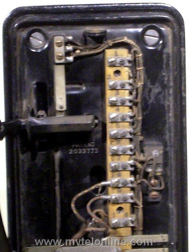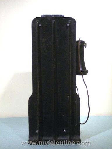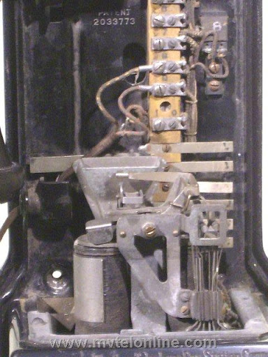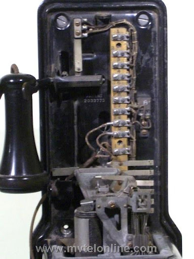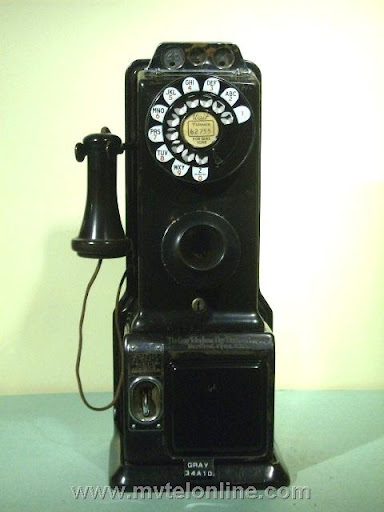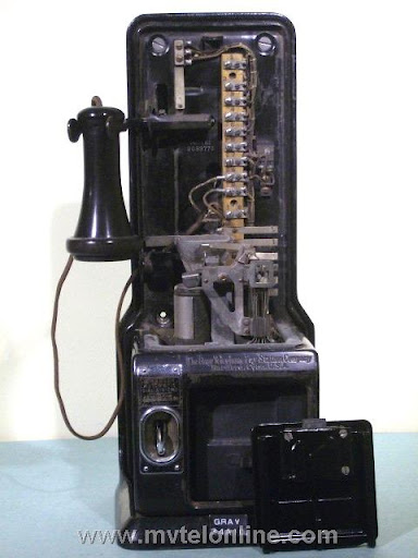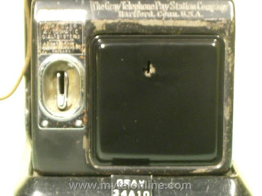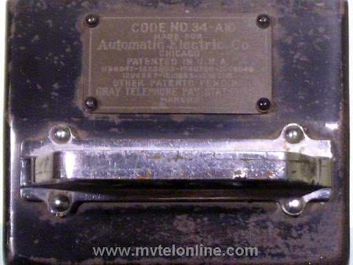 Gray #34-A-10, 5 cent Semi-post-pay paystation or payphone. Semi-post-pay is an automated system, the user lifts the receiver and dials the number desired, once the party answers the user drops a coin in. This phone has a very unusual coin return assembly with a very thin chute. This type chute probably clogged often. View my article Gray 34A-10