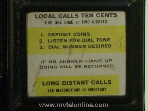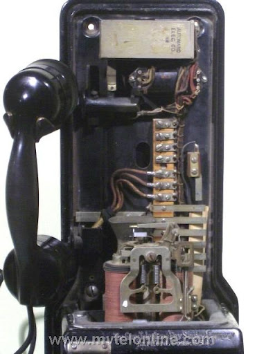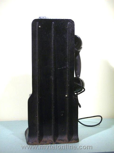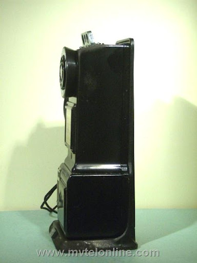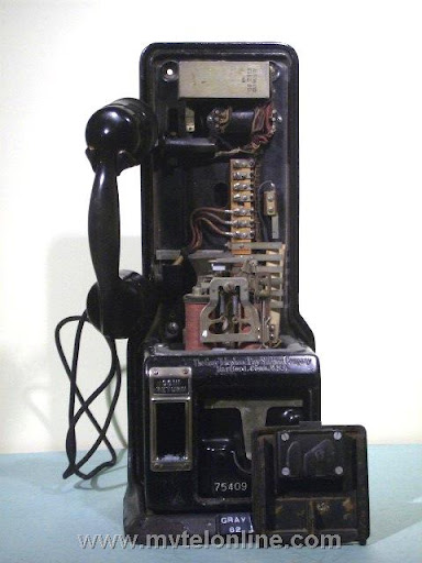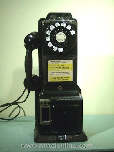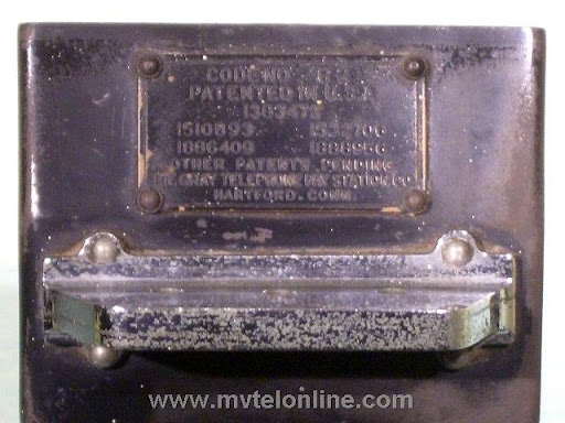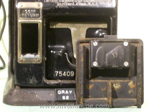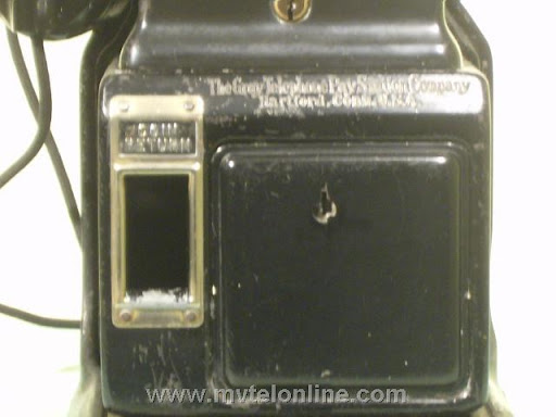 Gray #62, 5 cent prepay payphone or paystation. Probably made towards the end of Gray's existence, when Automatic Electric took over they started making model 62s. This phone is equipped with an Automatic Electric type 34 handset. The dial is AE, the shroud is Bakelite with a nice porcelain "daisy" face. It looks like at some point it was converted/upgraded to 10 cent operation. It is attached to a 139A bracket. View my article Gray 62