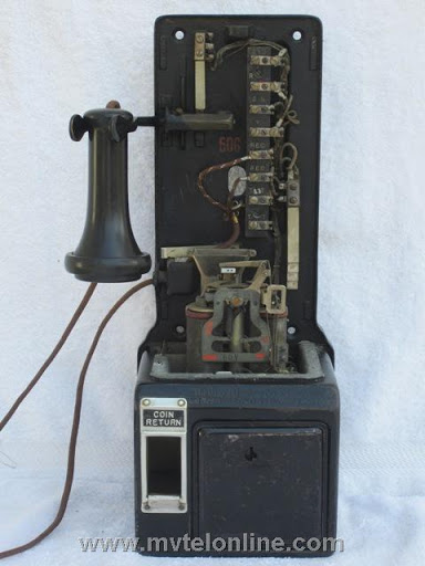 Gray #50G, 5 cent prepay automatic payphone or paystation. This antique telephone was made for the Bell System, it is equipped with Western Electric coin relay, #2AE dial, receiver & transmitter. The lead coin chute is Western Electric as well. The upper and the backboard are cast iron. Note the great instruction card with the phone number on it. View my related article Gray 50G