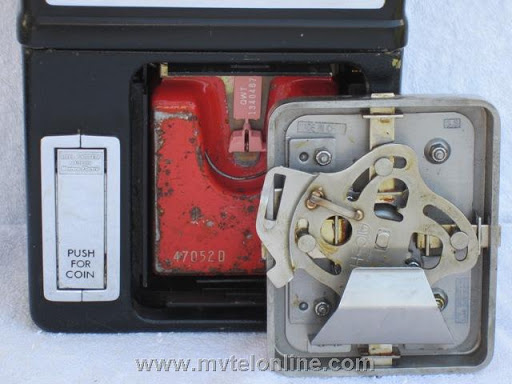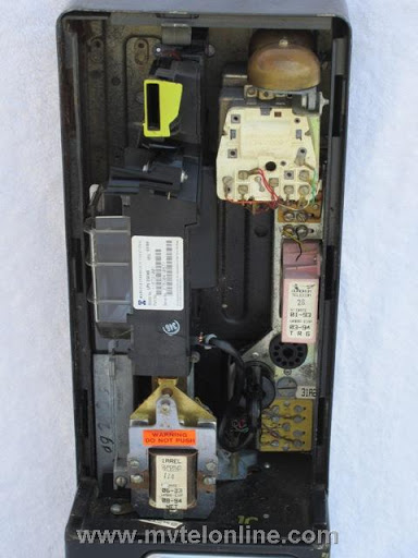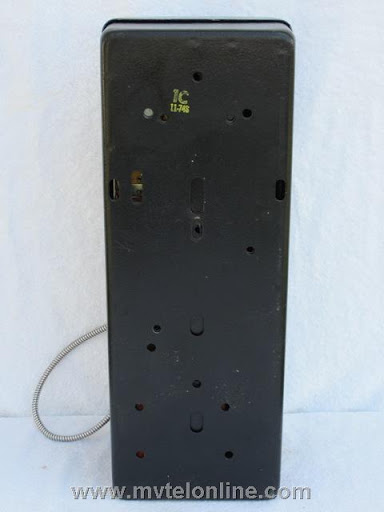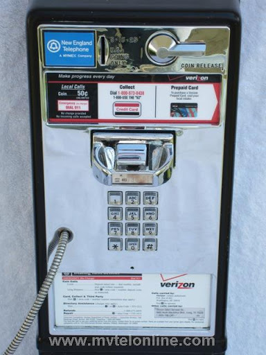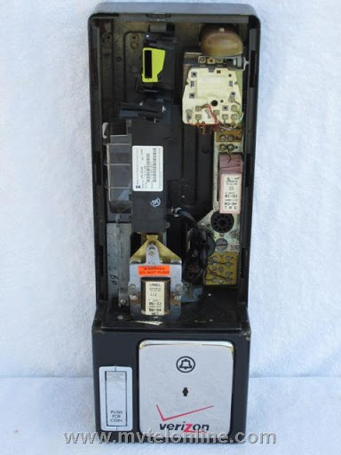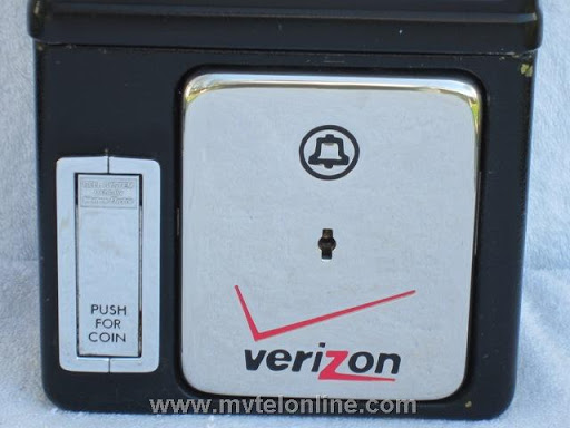 New England Telephone Co. 1C payphone from Springfield Mas. This phone became available after Verizon sold it's payphone business. It came from Springfield MA. It contains a Mars coin chute and an unusual AT&T dial assembly. Note the Verizon embossed vault door and the New England Telephone Co. porcelain sign in the upper left corner. Since the photos were taken correct locks were installed. The upper housing lock is a 29A-71 and the vault lock is a 30B.