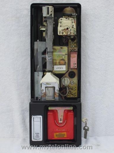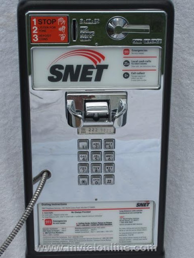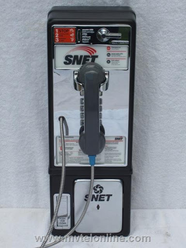 SNET (Southern New England Telephone) "dial tone first" 1C 25 cent Western Electric payphone. Has the original gray handset and orange porcelain instruction sign at the top left corner. Original SNET coin box in the vault. 29A-41 upper lock, 30C vault lock.